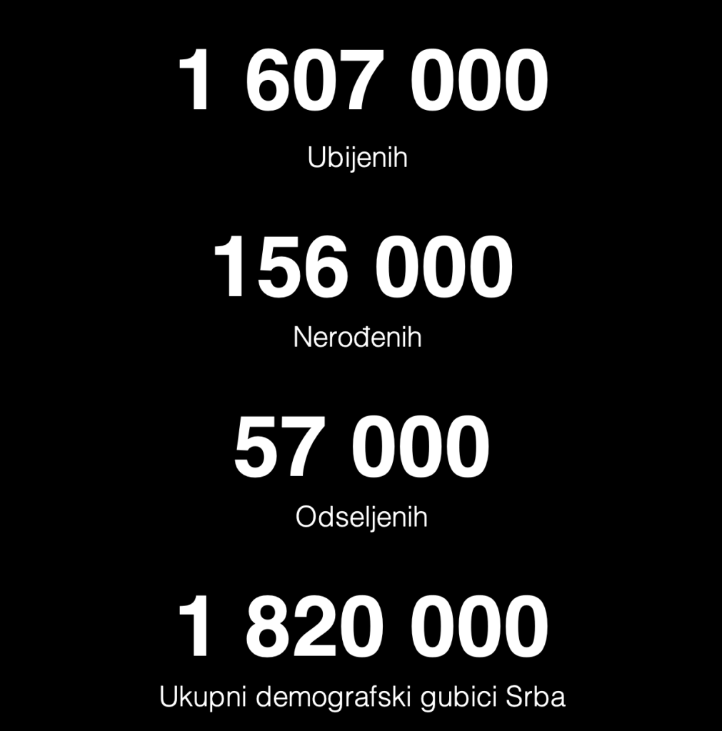 Demografskom statističkom metodom je utvrđeno da su, usvajanjem prosečne godišnje stope rasta 1,70 odsto za period 1931-1941 i 1,95 odsto za period 1941-1948, ukupni demografski gubici (Srba) u Drugom svetskom ratu iznosili 1 820 000, od kojih je 156 000 nerođenih, 57 000 odseljenih i 1607 000 ubijenih. (32) Ako je Srba u Jugoslaviji 1948. bilo 8 282 000, što je činilo 46,25 odsto od ukupnog broja stanovnika, onda 1 607 000 ubijenih Srba čini 16,25 odsto od njihovog ukupnog broja. U Drugom svetskom ratu Englezi su imali gubitke od 0,8 odsto, Italijani 0,9 odsto, Francuzi 1,4 odsto, Nemci 6,1 odsto, a SSSR 8,8 do 12,9 odsto.